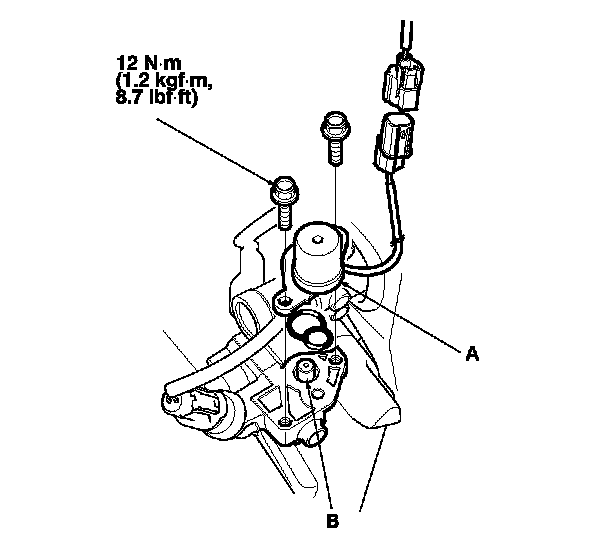 4. If the filter is not restricted, remove the rocker arm oil control solenoid (A) and push the valve (B) with your finger to check its movement. If the valve moves freely, it is normal, check the engine oil pressure. Testing and Inspection If the valve binds or sticks, replace the rocker arm oil control solenoid assembly.