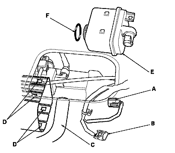 4. Pry the lock tabs (D) outward, and remove the EVAP canister vent shut valve (E).