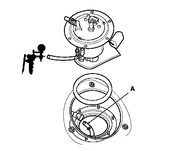 2. Disconnect the transfer tube (A), then connect a vacuum pump/gauge, 0-30 in.Hg, to the fuel tank unit.