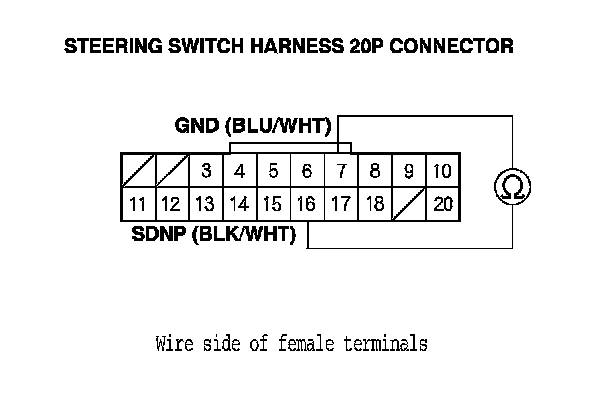 2. Check for continuity between steering switch harness 20P connector terminals No. 7 and No. 16 while pressing paddle shifter - (downshift switch), and when the paddle shifter - is released.