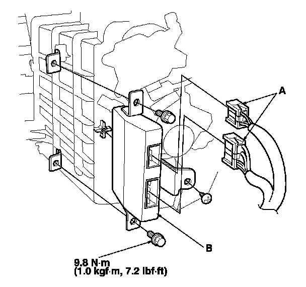 2. Disconnect the connectors (A) from the e-pretensioner unit (B).