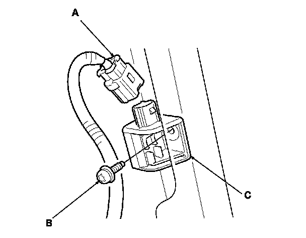 1. Install the new side impact sensor (second) (A) with the TORX bolt (B), then connect the floor wire harness 2P connector (C) to the side impact sensor (second).