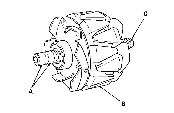 15. Check for continuity between each slip ring and the rotor (B) and the rotor shaft (C).