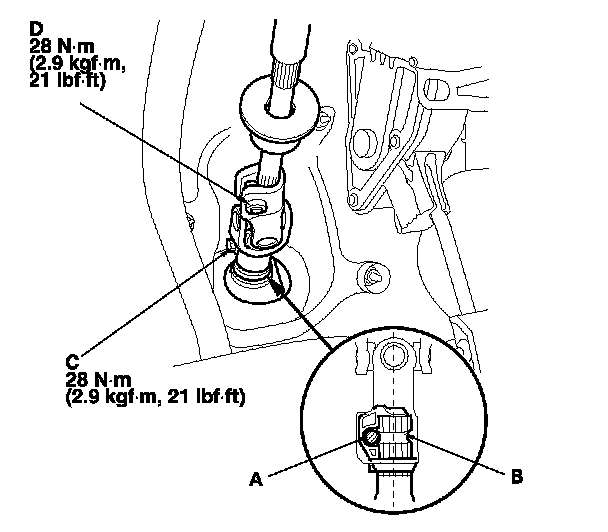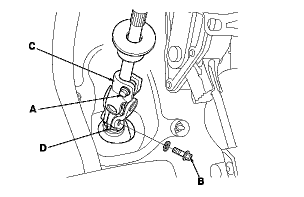 4. Insert the upper end of the steering joint into the steering shaft (A) (line up the bolt hole (B) with the flat portion (C) on the shaft), and loosely install the upper joint bolt (D).
