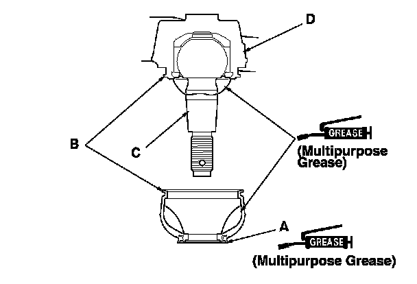 3. Wipe the grease off the tapered portion of the pin (C), and pack fresh grease into the base (D). Do not let dirt or other foreign materials get into the boot.