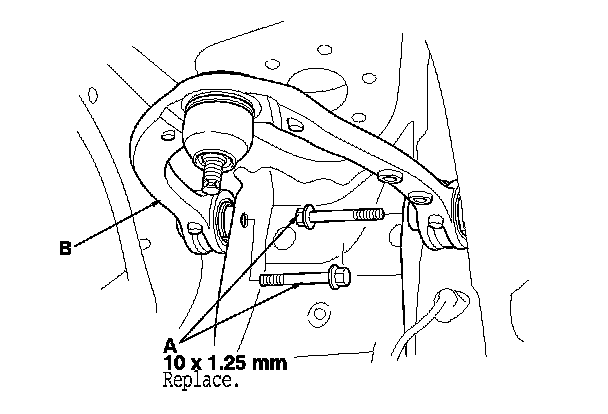 5. Remove the upper arm mounting bolts (A), then remove the upper arm (B).