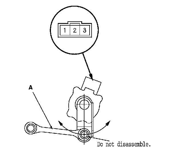 3. Measure the resistance between suspension stroke sensor 3P connector terminals No. 2 and No. 3 with the linkage (A) moved. There should be about 0.5-4.5 kOhms.