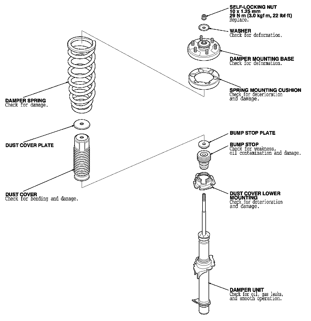 2. Release the pressure from the strut spring compressor, then disassemble the damper as shown in the Exploded View.