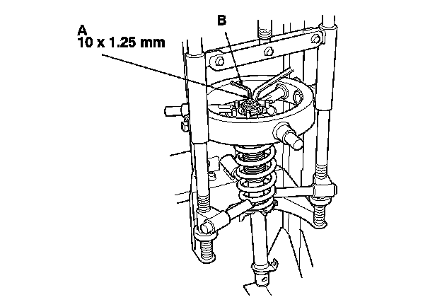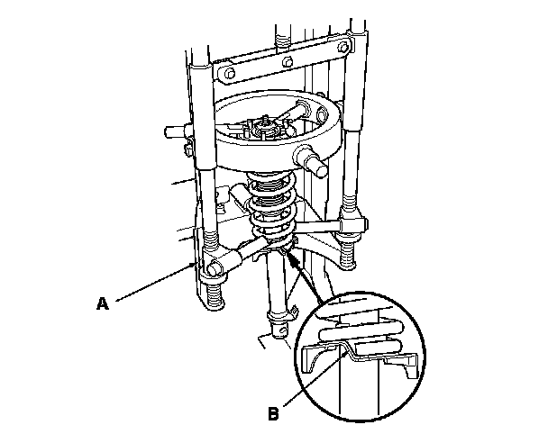 2. Install the damper assembly on a commercially available strut spring compressor (A), and compress the spring lightly.
