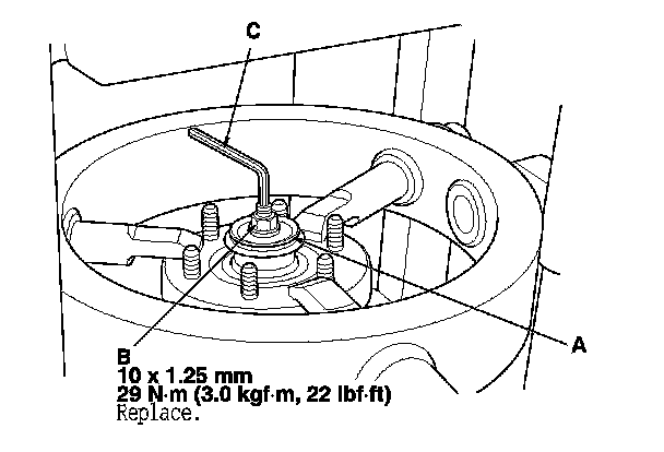 6. Install the washer (A) and a new 10 mm self-locking nut (B). Hold the damper shaft with a hex wrench (C), and tighten the 10 mm self-locking nut to the specified torque value.