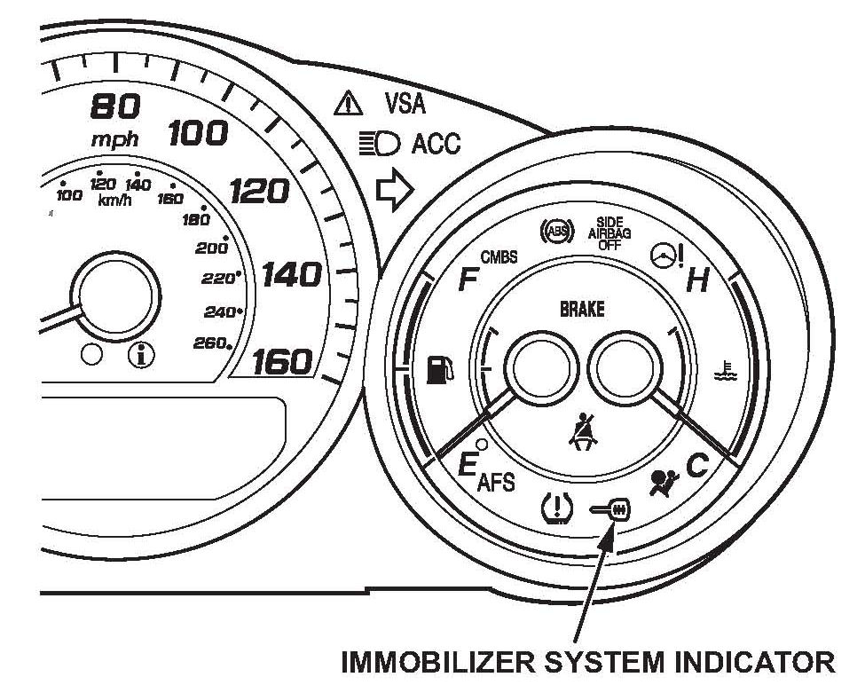 The immobilizer indicator is on the instrument panel. When you insert a programmed ignition key (master or valet) into the ignition switch and turn the switch to ON (II), the indicator comes on for 2 seconds and then goes off. When you turn the ignition switch to LOCK (0), the indicator blinks for 5 seconds and then goes off.