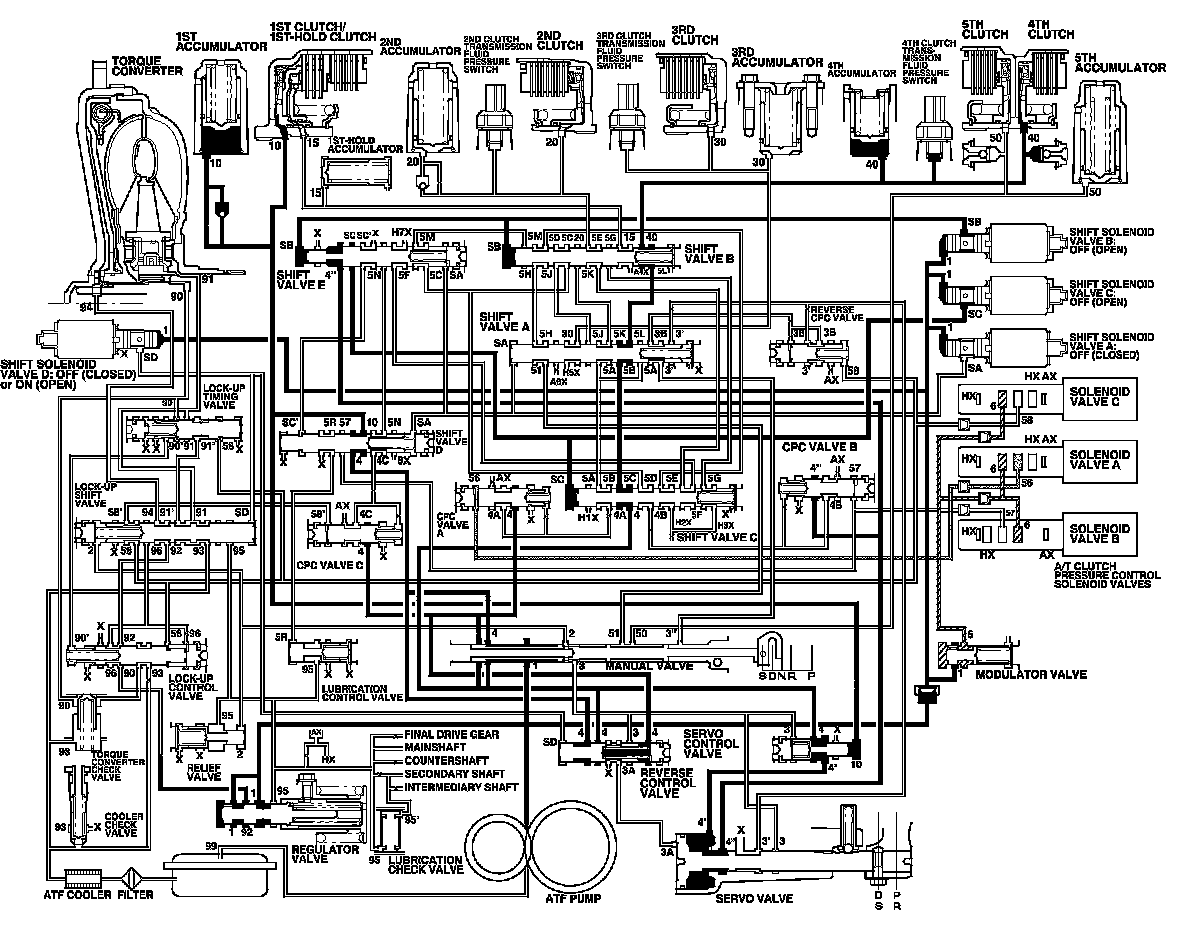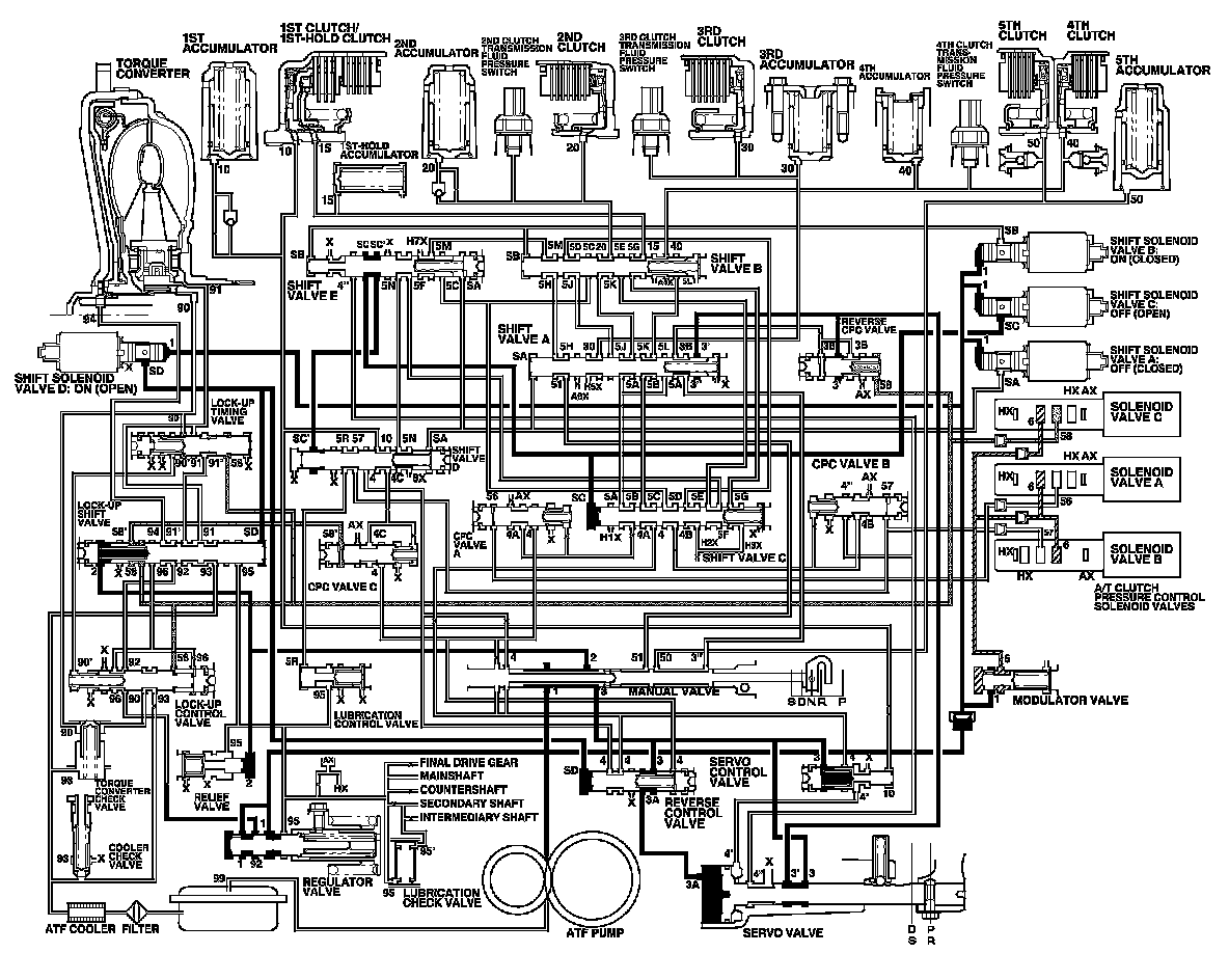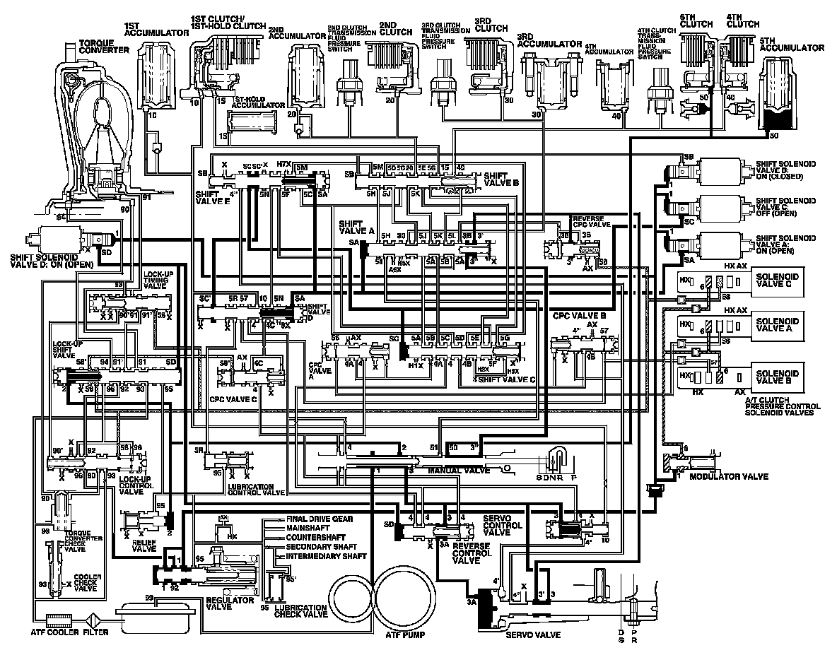 As the speed of the vehicle reaches the programmed value, the PCM turns shift solenoid valve A ON, and shift solenoid valve A uncovers shift solenoid valve A pressure port (SA) to shift valve A. Shift valve A is moved to the right side to switch the line pressure port (3') and reverse CPC pressure port (3B) leading to the 5th clutch. Line pressure (3) flows to the manual valve via the servo valve and shift valve A, and becomes 5th clutch pressure (50) at the manual valve. The 5th clutch pressure (50) flows to the 5th clutch, and the 5th clutch is engaged by the line pressure.