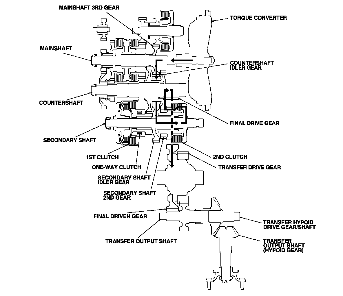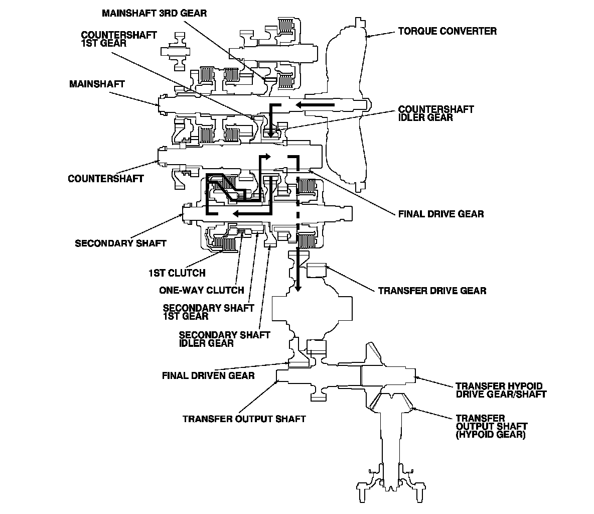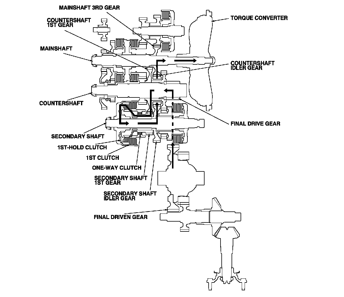 - Hydraulic pressure is applied to the 1st clutch, then the 1st clutch engages the secondary shaft 1st gear with the secondary shaft by the one-way clutch.