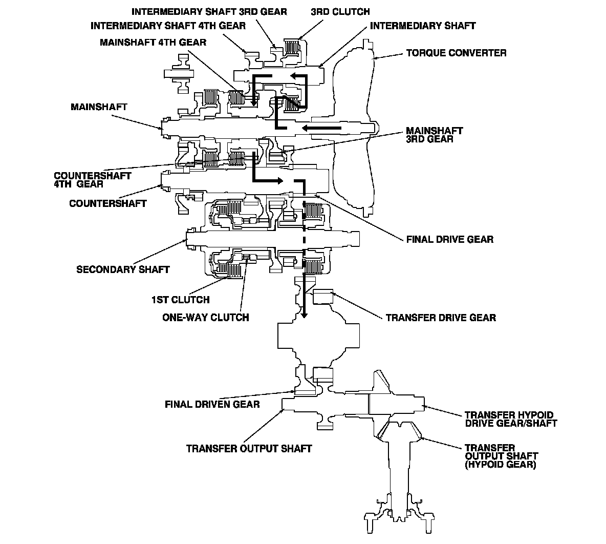- Hydraulic pressure is applied to the 3rd clutch, then the 3rd clutch engages the intermediary shaft 3rd gear with the intermediary shaft.