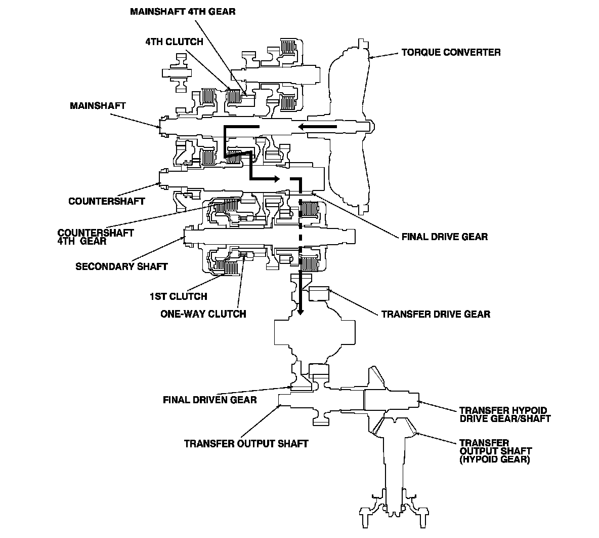 - Hydraulic pressure is applied to the 4th clutch, then the 4th clutch engages the mainshaft 4th gear with the mainshaft.