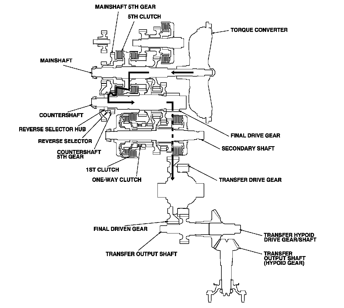 - Hydraulic pressure is applied to the 5th clutch, then the 5th clutch engages the mainshaft 5th gear with the mainshaft.