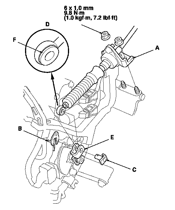 6. Check the bushing (F) in the shift cable end for a proper fit and wear. If the bushing is loose or worn, replace the shift cable. Service and Repair