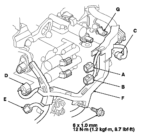 8. Remove the bolt securing the harness cover (F), and remove the harness cover from its bracket (G).