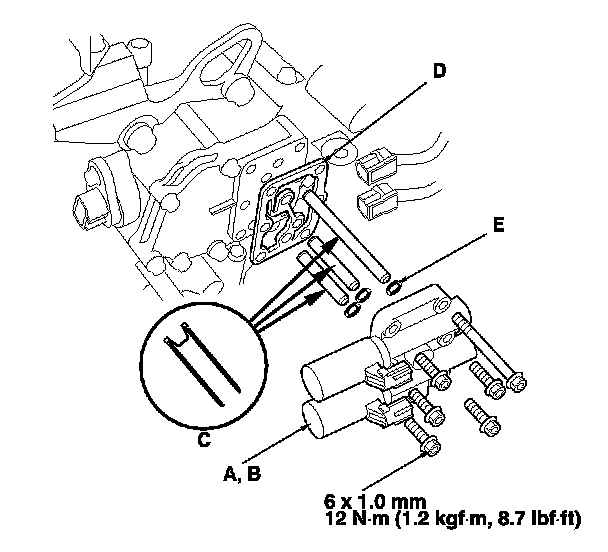 9. Remove the A/T clutch pressure control solenoid valves A and B, ATF pipes (C), gasket (D), and O-rings (E).