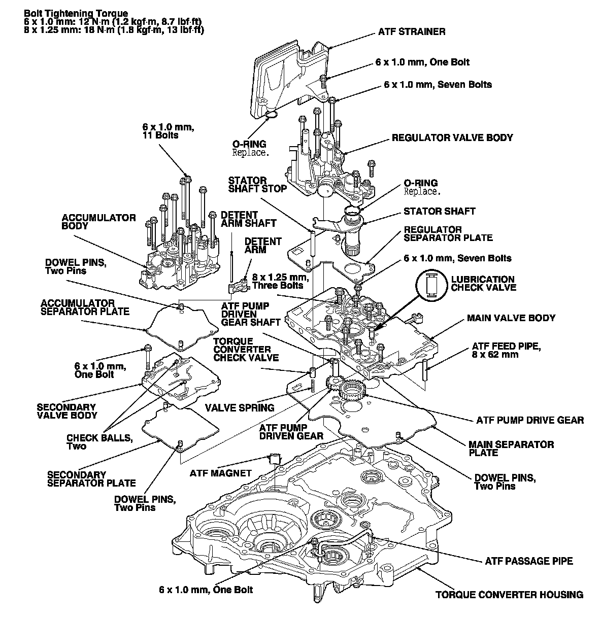 11. Install the 8 x 62 mm ATF feed pipes in the main valve body, and install the accumulator body (11 bolts).
