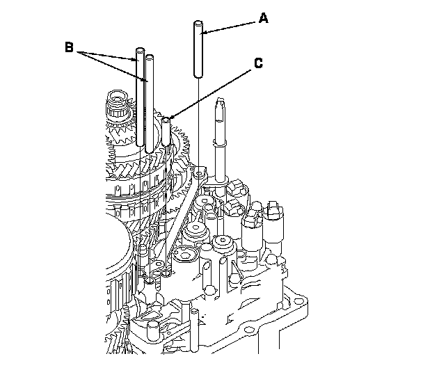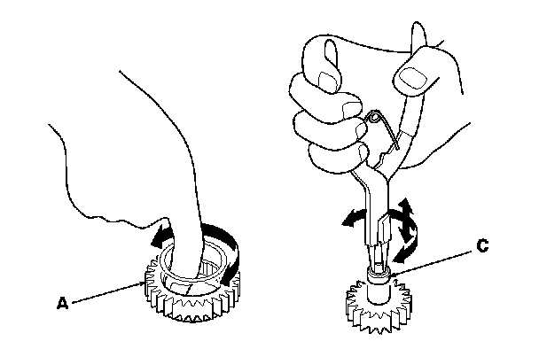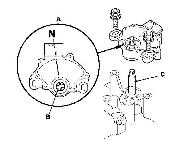 4. Install the main valve body (seven 6 mm bolts and three 8 mm bolts). Make sure the ATF pump drive gear (A) rotates smoothly in the normal operating direction, and the ATF pump driven gear shaft (C) moves smoothly in the axial and normal operating direction.