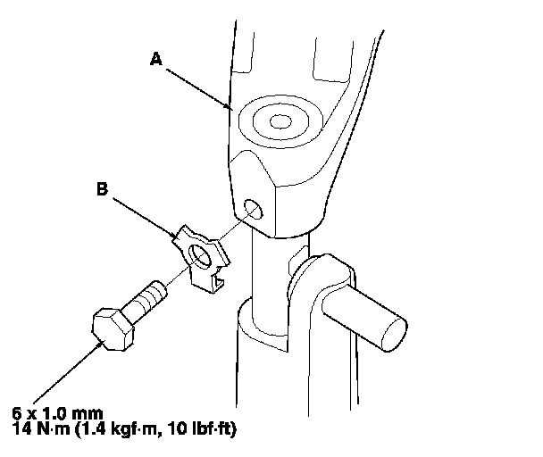 27. Secure the shift fork (A) to the shift fork shaft with the lock bolt and the new lock washer (B), then bend the lock tab of the lock washer against the bolt head.