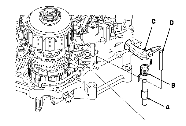28. Install the park pawl shaft (A), pawl spring (B), park pawl (C), and park pawl stop (D).