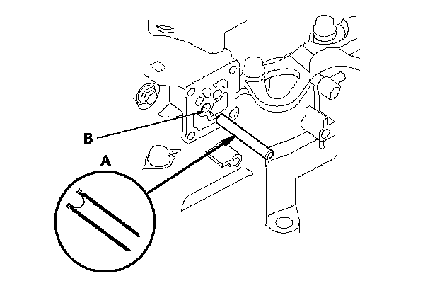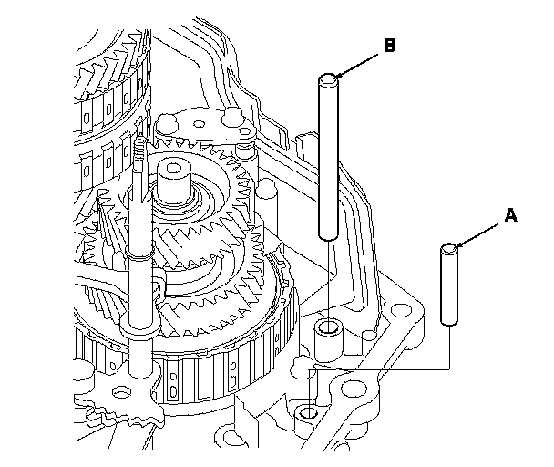 60. Set the transmission range switch (A) to the N position. The transmission range switch clicks in the N position, and the selector control shaft hole (B) aligns with the N positioning line.