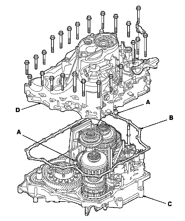 34. Place the transmission housing (D) on the torque converter housing.