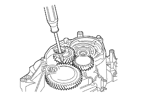 35. Wrap a screwdriver tip with tape to prevent damage to the reverse idler gear teeth. Engage the reverse idler gear with the reverse gears by rotating the idler gear with the screwdriver.