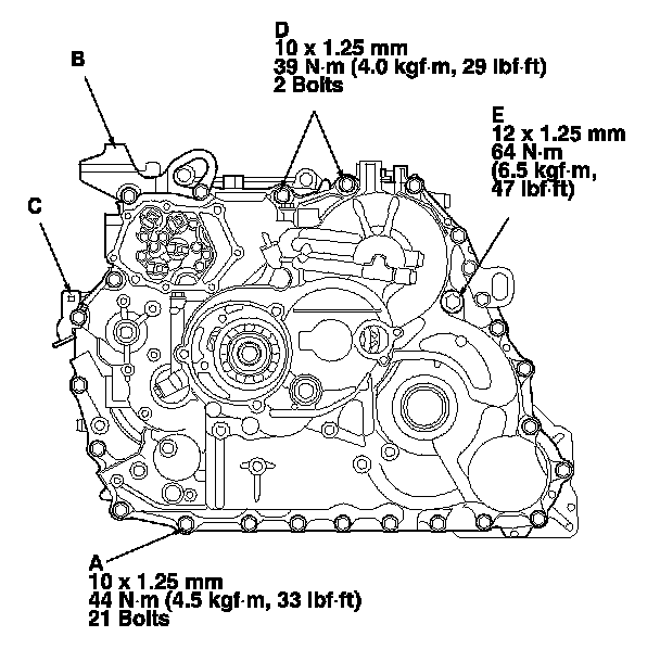 39. Install and tighten the 12 x 1.25 mm bolt (E) to 64 N-m (6.5 kgf-m, 47 lbf-ft).