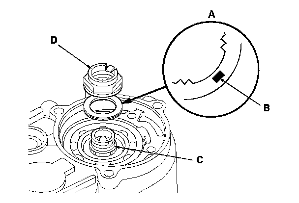41. Install the new lock washer (A) with the marked side (B) up over the mainshaft (C), and apply ATF to surfaces of the lock washer and old locknut (D).