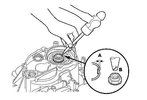 43. Install the new locknut and tighten it to 178 N-m (18.2 kgf-m, 132 lbf-ft), then stake the locknut to a depth (A) of 0.7-1.3 mm (0.03-0.05 in.) using a 3.5 mm punch (B).