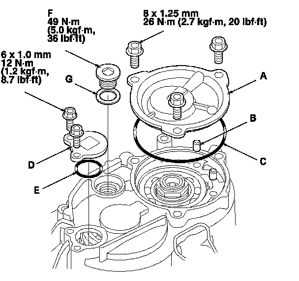 46. Apply thread lock sealant to the threads of the sealing plug (F), and install the sealing plug and the new sealing washer (G).