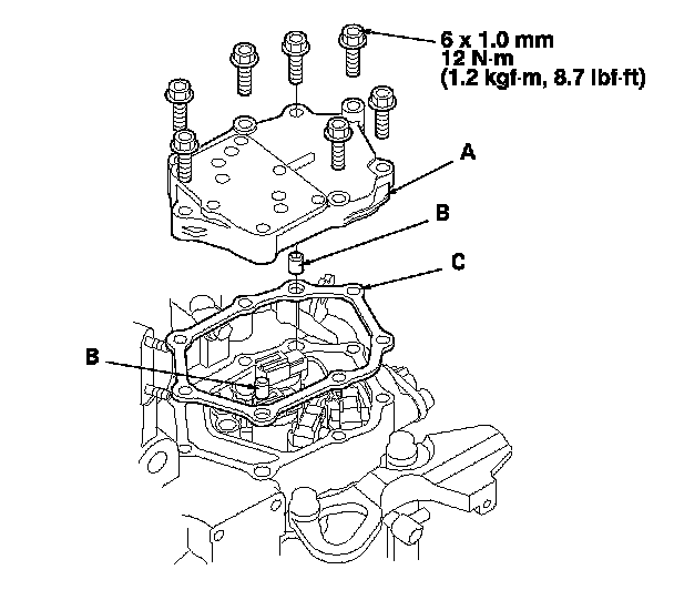 51. Install the solenoid valve cover (A) with the two dowel pins (B) and the new gasket (C), and secure it with the seven bolts.