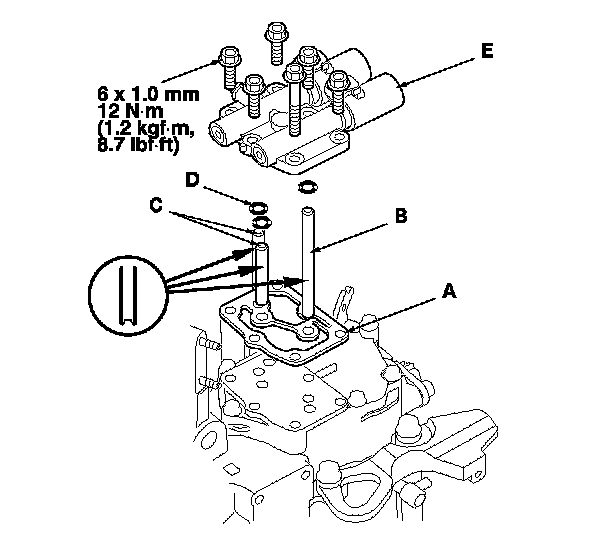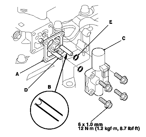 53. Install the new O-rings (D) over the ATF feed pipes, and install A/T clutch pressure control solenoid valves A and B (E).