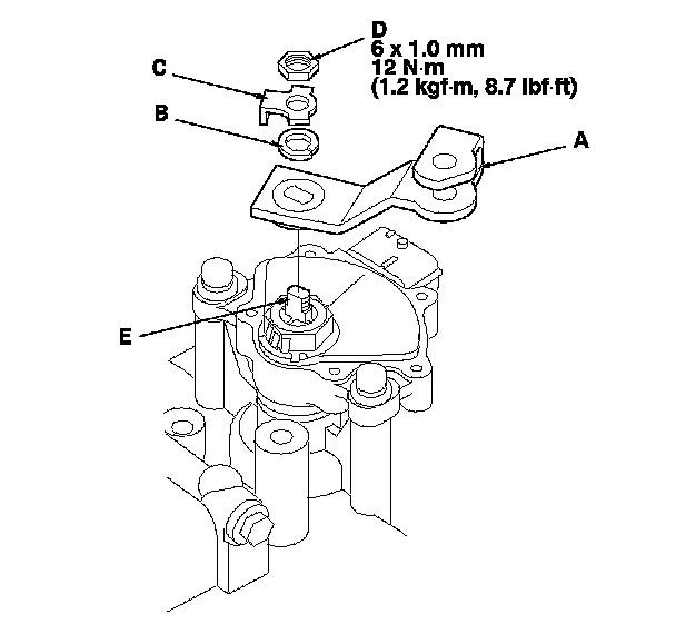 62. Install the new lock washer (A) over the selector control shaft (B) by aligning the indicator tab (C) of the lock washer with the N positioning line (D) on the transmission range switch (E), and install the locknut (F).