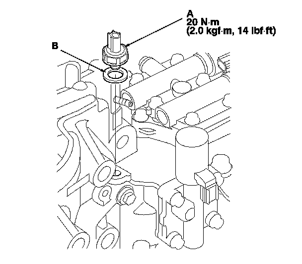 73. Install the 2nd clutch transmission fluid pressure switch (A) with the new sealing washer (B). Tighten the switch by gripping the metal part.