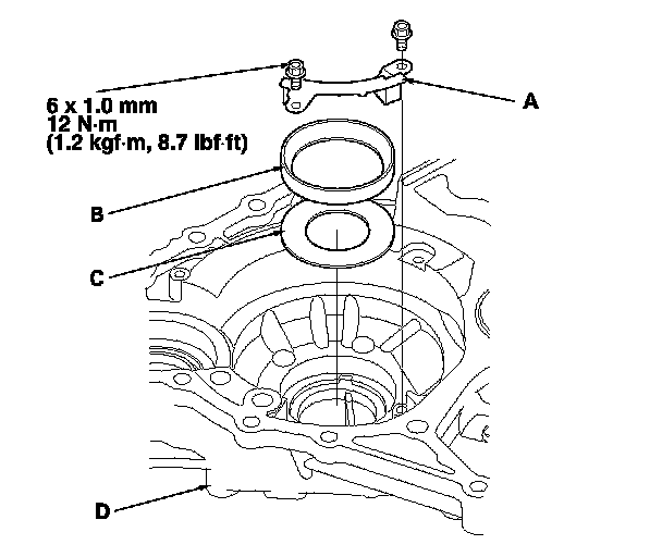 4. Remove the plate (A), and remove the bearing outer race (B) and spacer (C) from the torque converter housing (D).