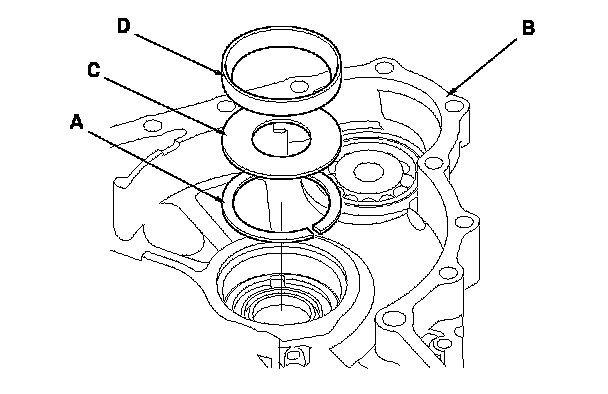 5. Install the spacer (C), and the bearing outer race (D) in the transmission housing.