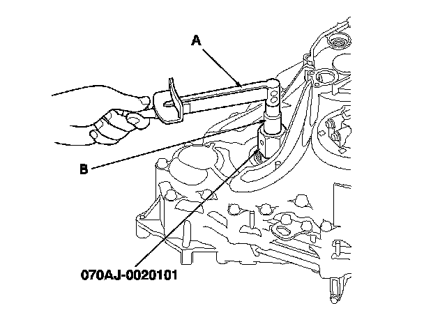 10. Measure the starting torque of the differential assembly with the preload inspection tool, a torque wrench (A), and a socket (B). Measure the starting torque at normal room temperature in both directions.