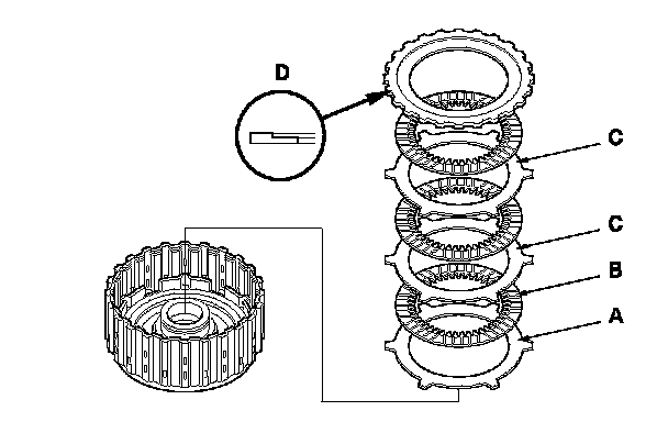3. Install the 1st-hold clutch flat-plate (A), and alternately install the clutch discs (B) (3) and clutch wave-plates (C) (2) starting with the disc, then install 1st-hold clutch plate B (D) with the flat side down on the top disc.
