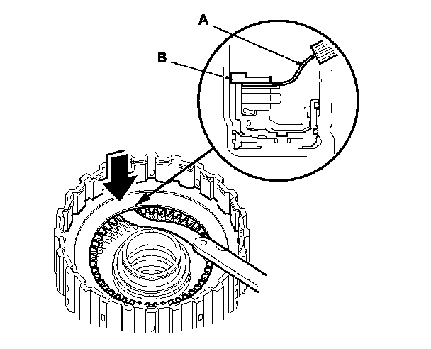 4. Measure the clearance between the 1st-hold clutch plate B and top disc with a feeler gauge (A) while pressing the 1st-hold clutch plate B down. Take measurements in at least three places, and use the average as the actual clearance.
