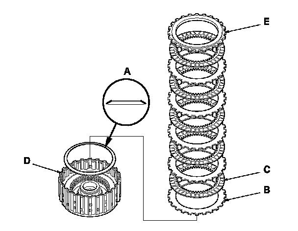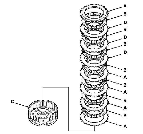 9. Starting with the 3rd clutch flat-plate, alternately install the flat-plates (A) (3) and discs (B) (3) in the 3rd clutch drum (C), and alternately install the wave-plates (D) (3) and discs (B) (3). Install the clutch end-plate (E) with the flat side down on the top disc.
