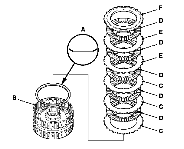 10. Install the disc spring (A) in the 4th clutch drum (B) in the direction shown. Starting with the 4th clutch flat-plate, alternately install the flat-plates (C) (3) and discs (D) (3), and alternately install the wave-plates (E) (2) and discs (D) (2). Install the clutch end-plate (F) with the flat side down on the top disc.