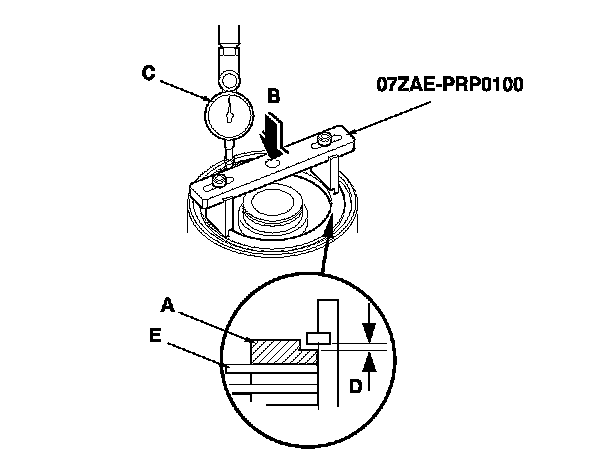 17. The dial indicator reads the clearance (D) between the clutch end-plate and top disc (E). Take measurements in at least three places, and use the average as the actual clearance.