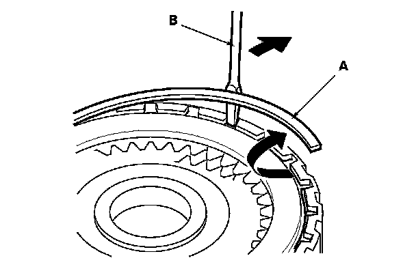 1. Remove the snap ring (A) with a screwdriver (B).