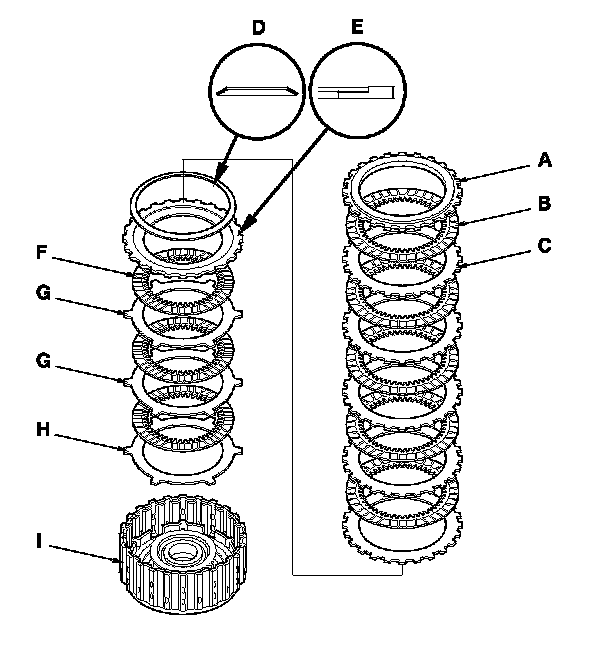 2. Remove the 1st clutch end-plate (A), 1st clutch discs (B) (5), 1st clutch wave-plates (C) (5), disc spring (D), 1st-hold clutch plate B (E), 1st-hold clutch discs (F) (3), 1st-hold clutch wave-plates (G) (2), and flat-plate (H) from the 1st/1st-hold clutch drum (I).