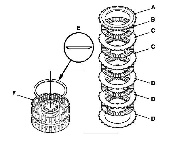 8. Remove the clutch end-plate (A), clutch discs (B) (5), clutch wave-plates (C) (2), clutch flat-plates (D) (3), and the disc spring (E) from the 4th clutch drum (F).