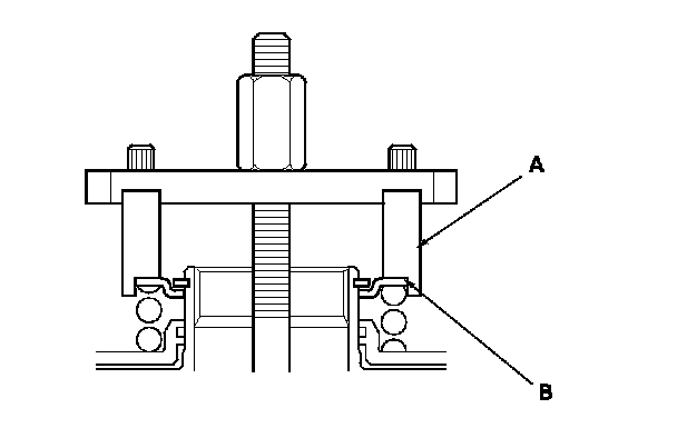 13. Be sure the clutch spring compressor attachment (A) is adjusted to have full contact with the spring retainer (B) on the 1st, 2nd, and 4th clutches.